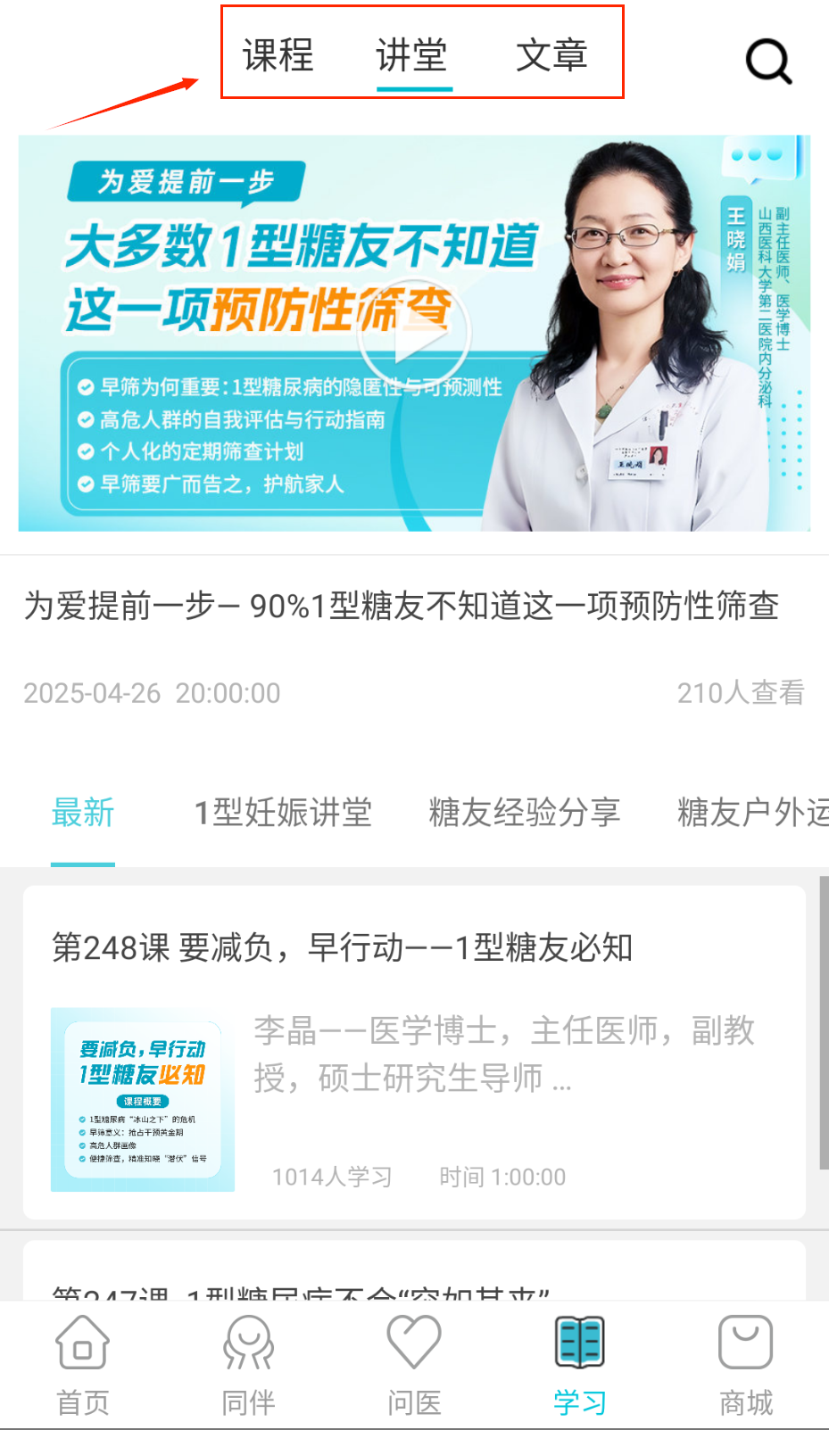 2、点击“讲堂”标签,查看糖尿病预防和管理课程,获取专业知识。