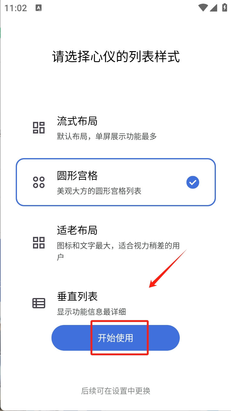 2、选择列表样式:选择您喜欢的布局样式,如“圆形宫格”,然后点击“开始使用”。