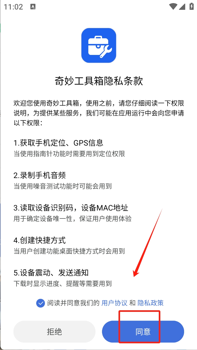 1、阅读并同意隐私条款:查看应用权限说明,点击“同意”按钮以继续。