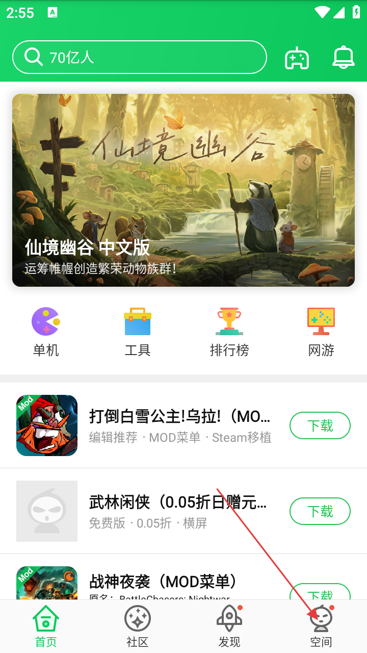 1、打开应用进入首页,点击底部【空间】选项,可进入个人空间页面。