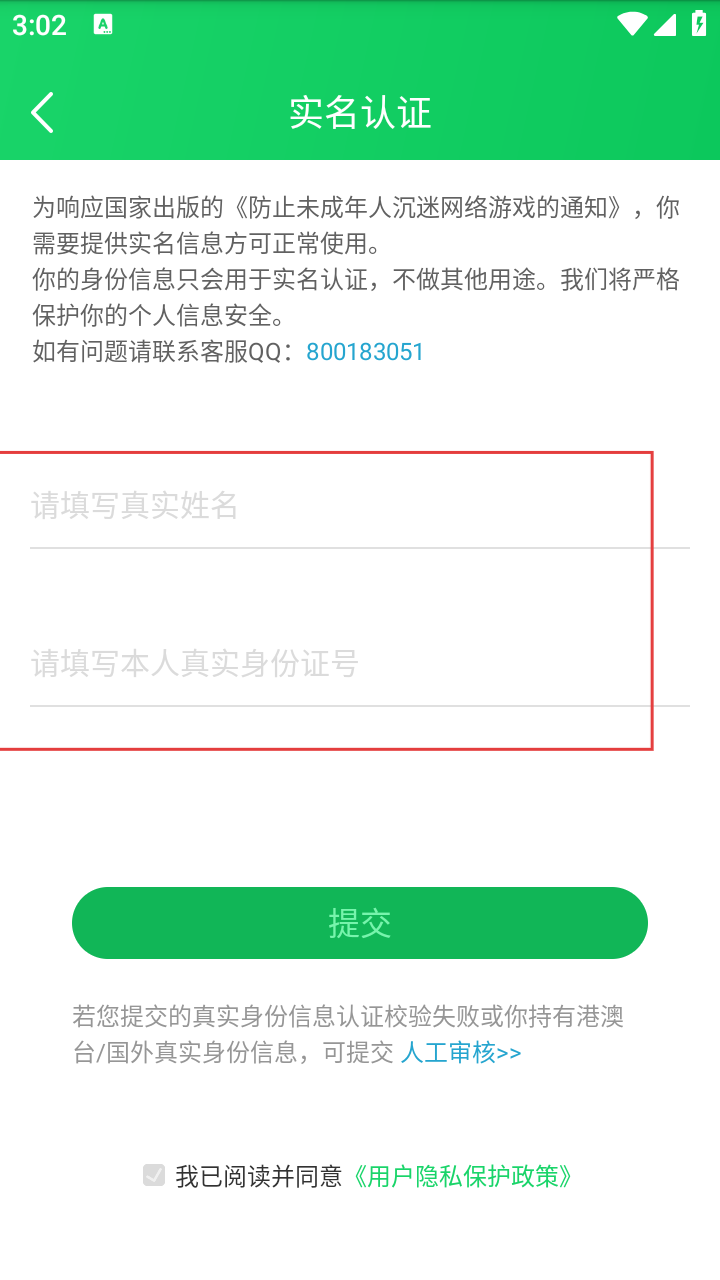 4、在实名认证页面,填写真实姓名和身份证号,勾选同意隐私政策后点击提交,即可完成实名认证流程。