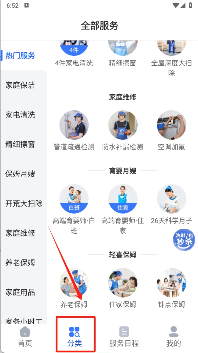 1、首先,打开“轻喜到家”应用,点击首页的“分类”按钮,浏览并选择您需要的家政服务类型,如全屋保洁或家电清洗。