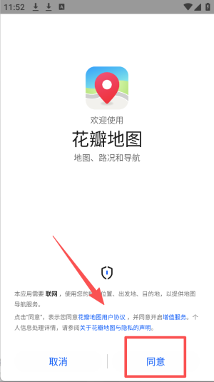 1、同意服务条款,点击“同意”按钮,接受地图服务条款。