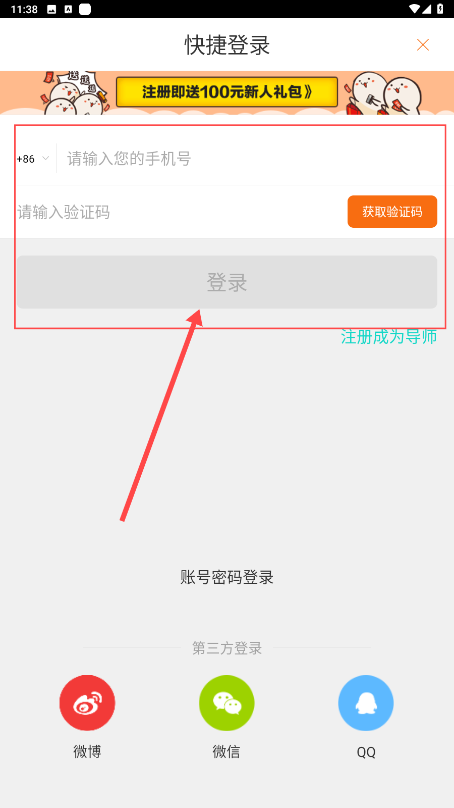 3、输入手机号码,获取验证码,然后点击【登录】就能跟好友聊天啦。
