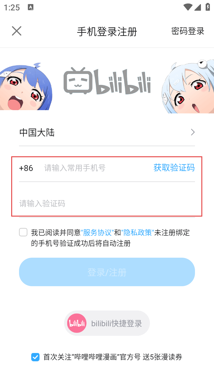 4、勾选同意服务协议和隐私政策后,点击【登录/注册】按钮,完成哔哩哔哩漫画的登录流程。