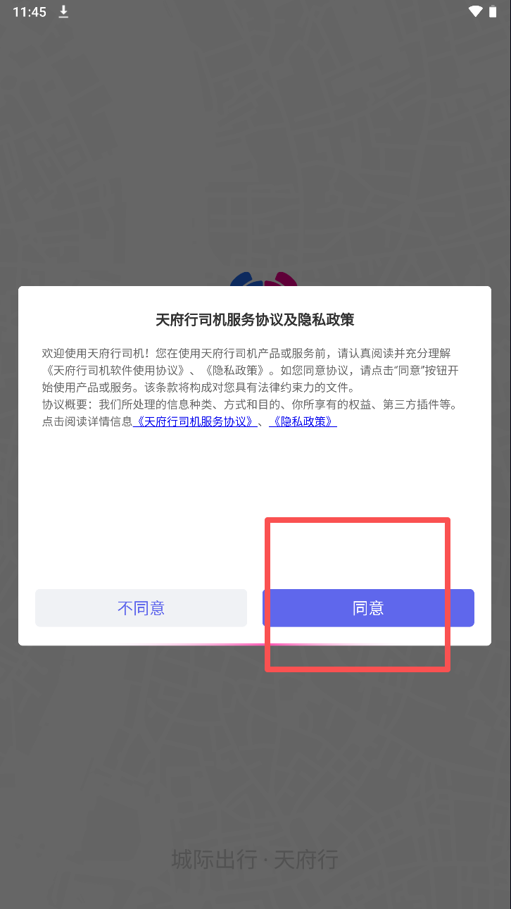 1、点击“同意”按钮,表示您已阅读并同意天府行司机服务协议及隐私政策。