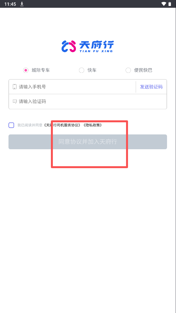 2、输入手机号并同意相关协议,然后点击“同意协议并加入天府行”按钮。