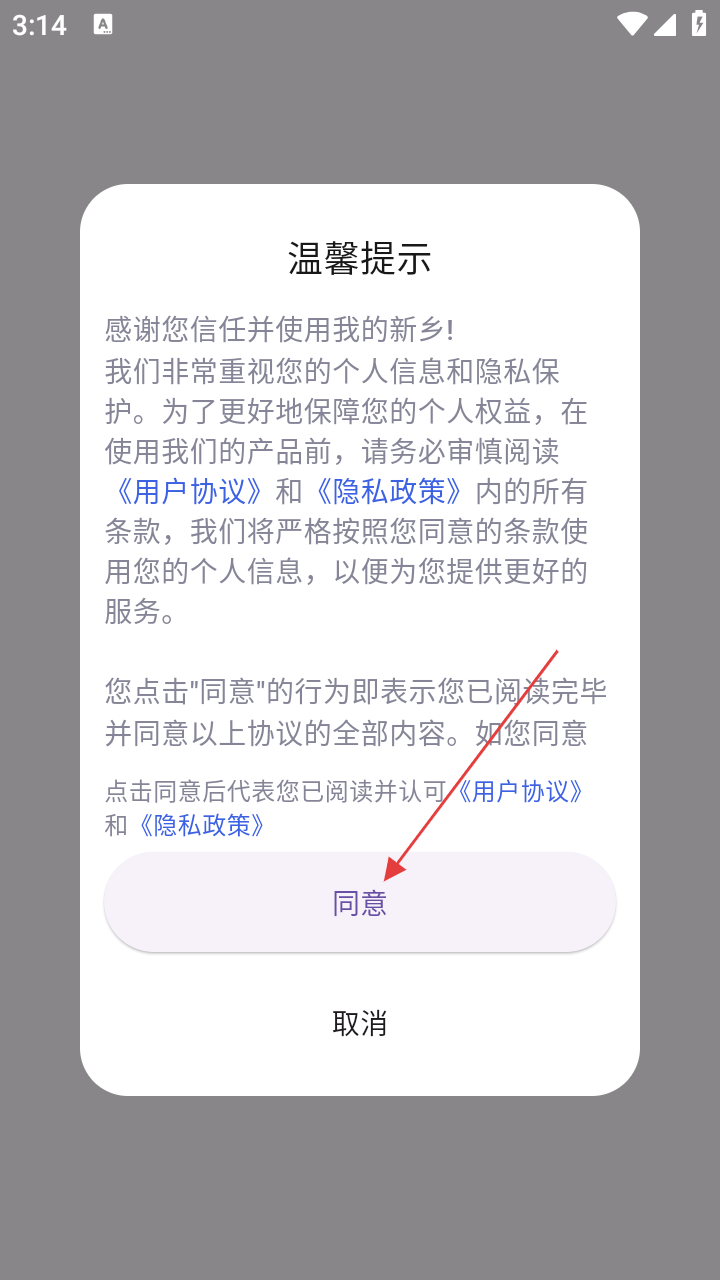 1、首次打开我的新乡,弹出【温馨提示】,点击【同意】,确认《用户协议》和《隐私政策》。