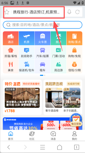 4、在携程旅行App首页,点击搜索框,查找酒店、机票等旅行服务。