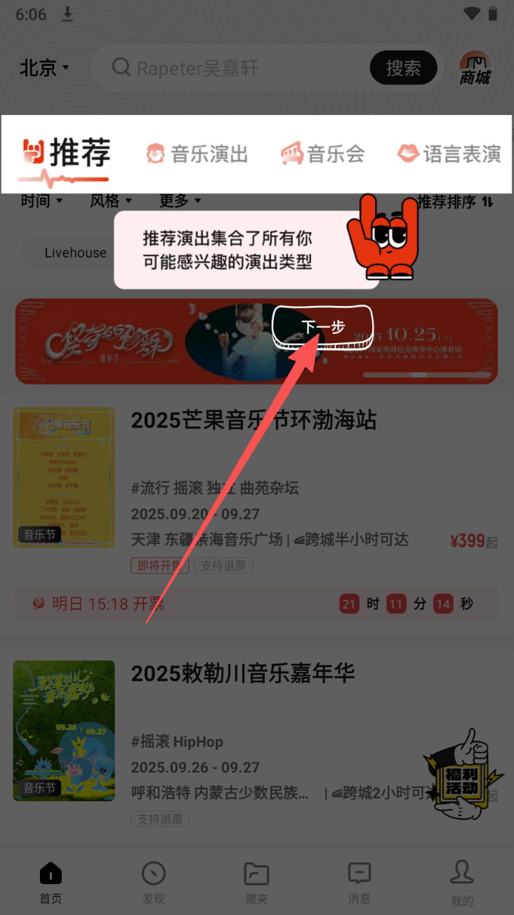2、浏览推荐演出。在首页查看推荐演出并点击感兴趣的演出。
