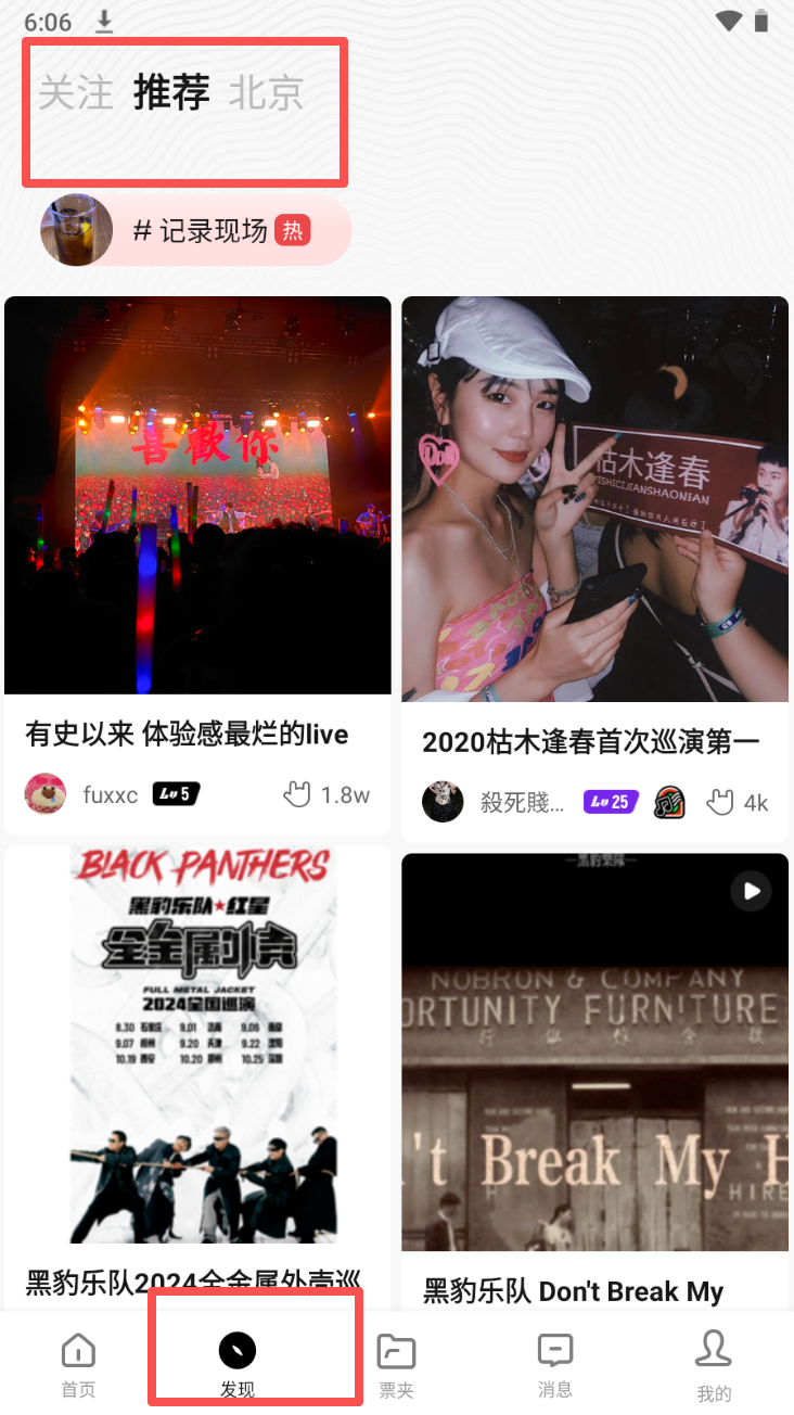 3、查看发现页面。点击“发现”查看更多演出信息和视频。