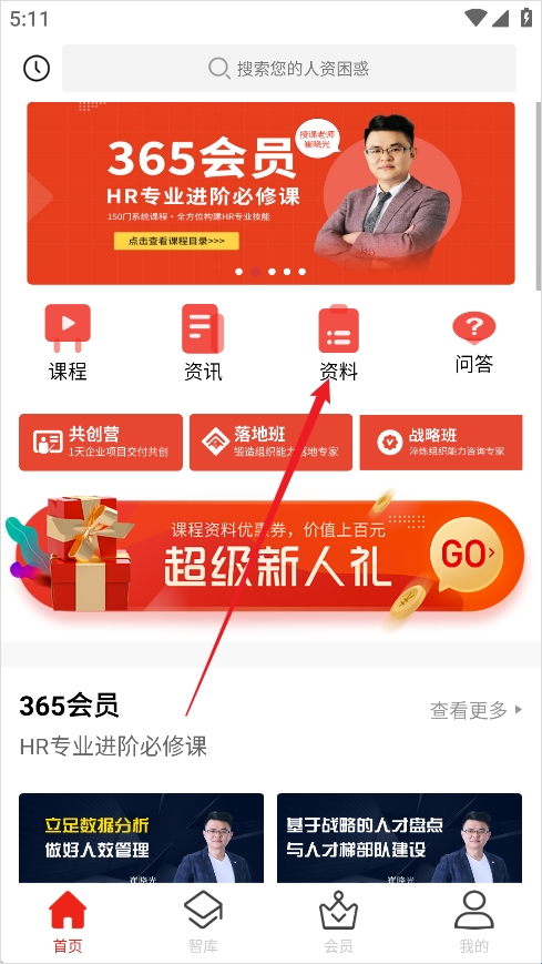1、打开儒思hr官方版,进入首页后找到并点击【资料】模块;