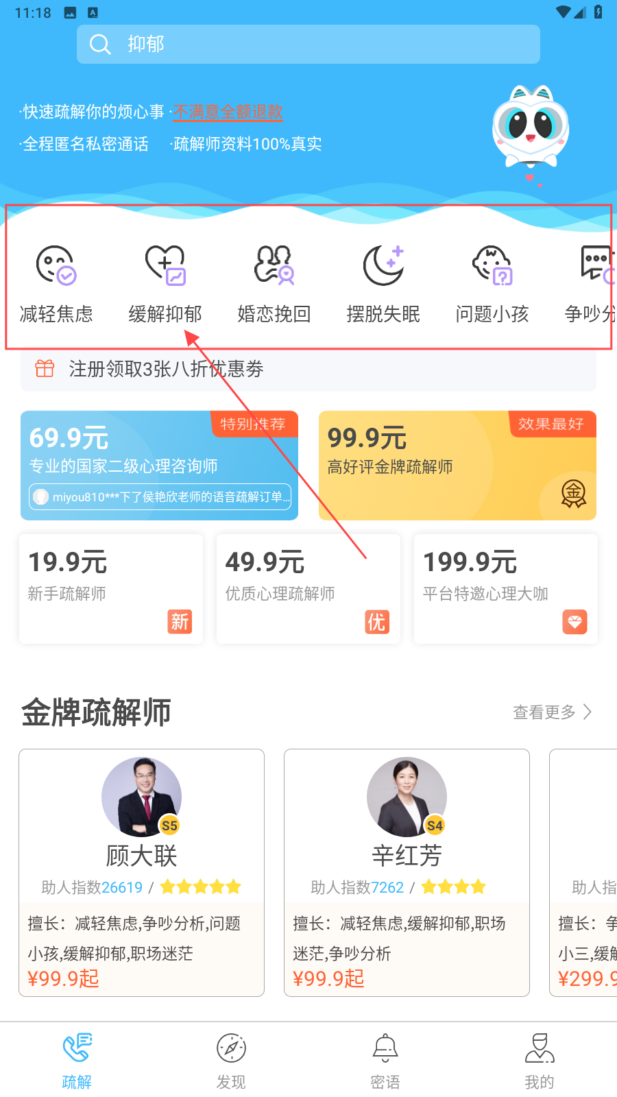 3、多维度咨询领域:覆盖情感、婚姻、职场、亲子、学业等10+咨询领域,满足多样化心理需求。