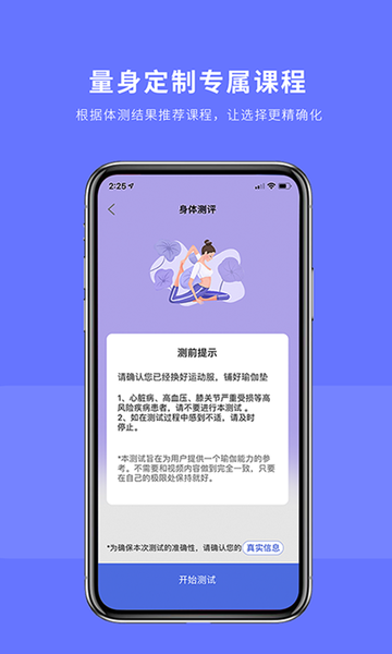 1、首次使用时需完成基础身体测评,填写身高体重及柔韧度等信息以便系统推荐个性化课程,整个过程仅需三分钟即可完成。
