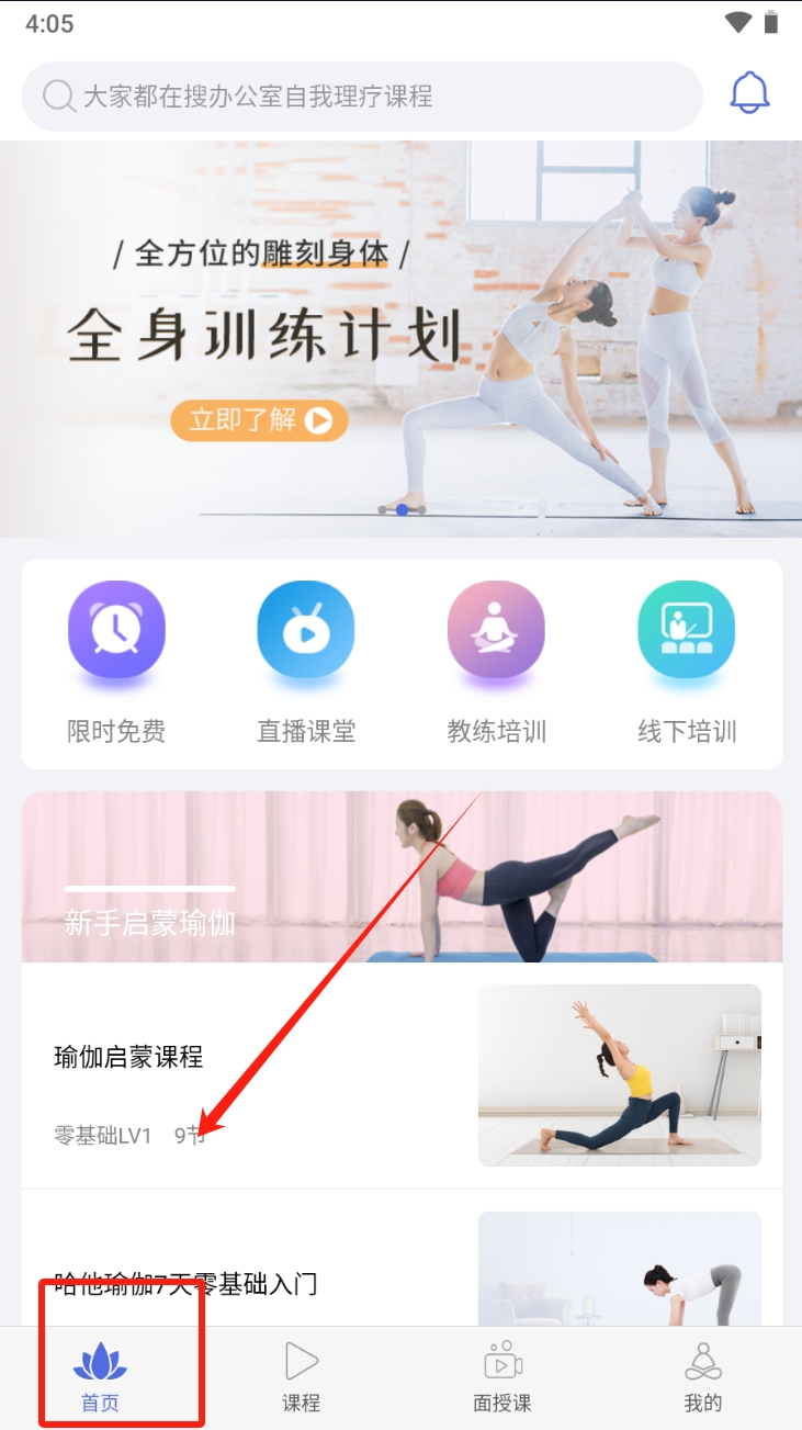 1、点击“首页”按钮,浏览推荐的健身课程和训练计划。