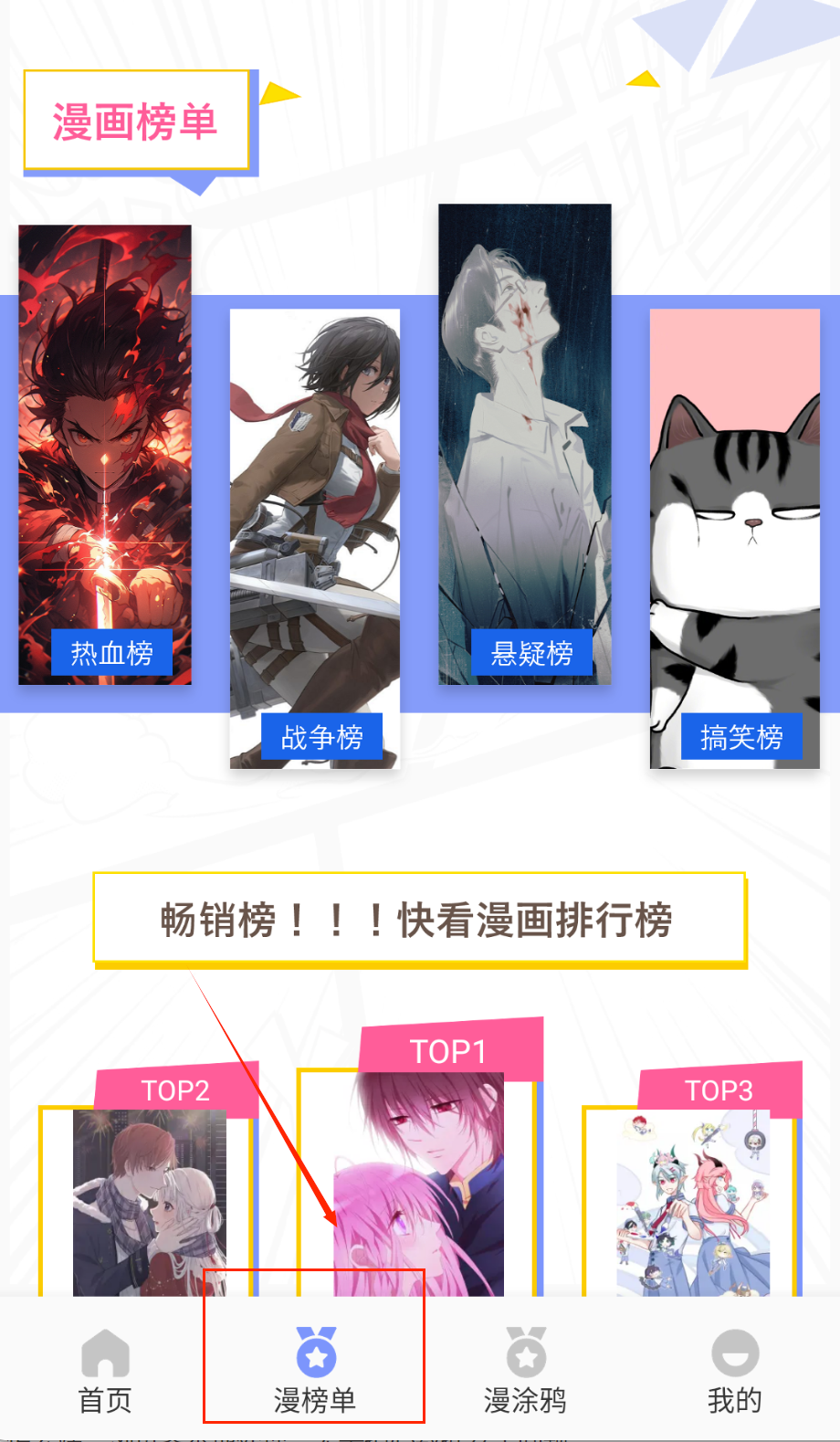 1、打开漫画软件后首先会看到底部导航栏,包含首页、漫榜单、漫涂鸦和我的四个主要功能区,新手建议从首页开始探索。