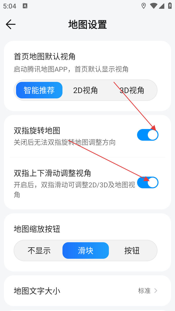 4、进入地图设置页面后,可对【首页地图默认视角】【双指旋转地图】等功能进行设置,打造个性化地图使用体验。