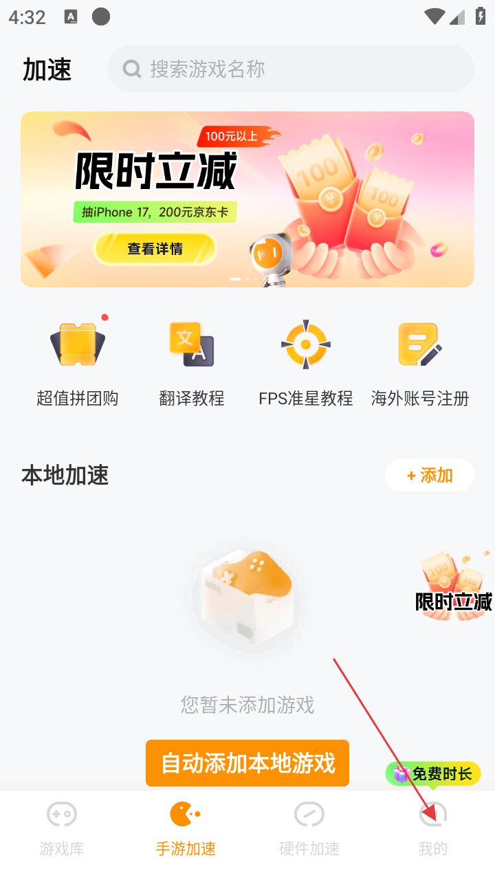 1、打开雷神加速器APP,进入【手游加速】页面后,点击右下角【我的】按钮,进入个人相关页面。