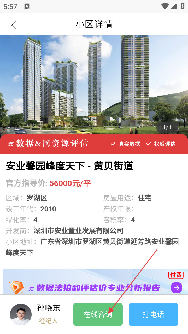 3、在小区详情页面,可查看小区的官方指导价、区域、竣工年代等信息,若需要咨询,点击【在线咨询】按钮。