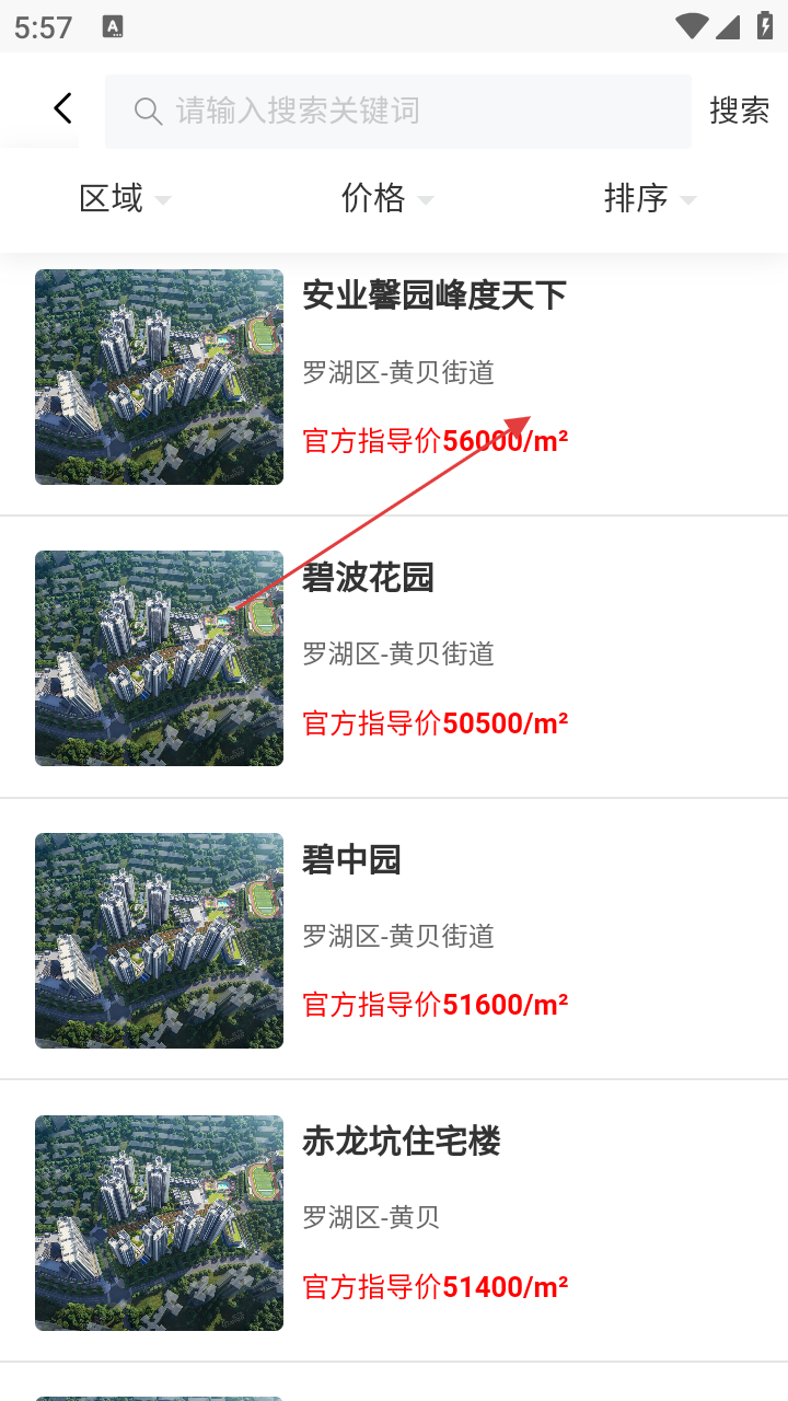 2、在小区列表页面,找到感兴趣的小区,如“安业馨园峰度天下”,点击进入该小区详情页面。