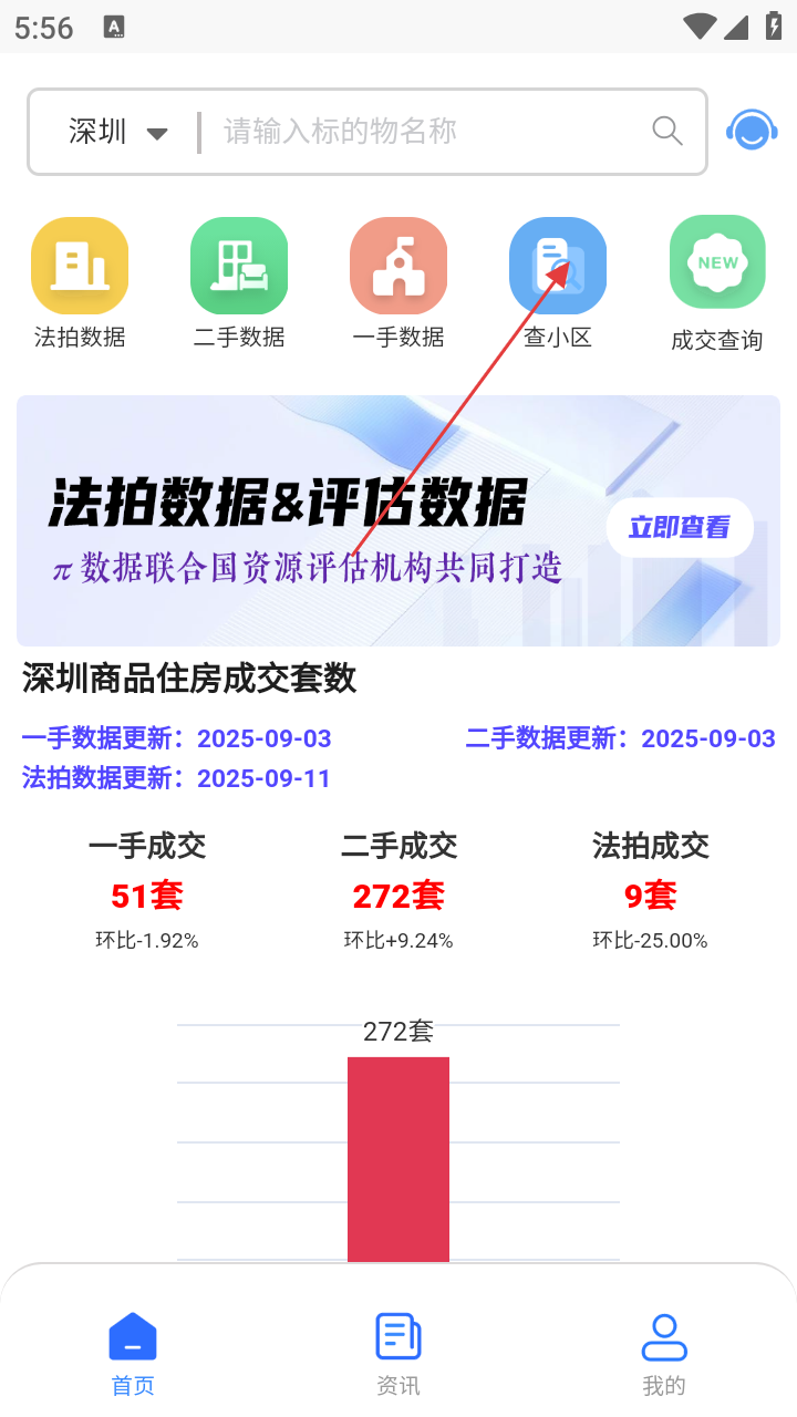 1、打开π数据APP,进入首页后,点击页面上方的【查小区】图标,进入小区列表页面。