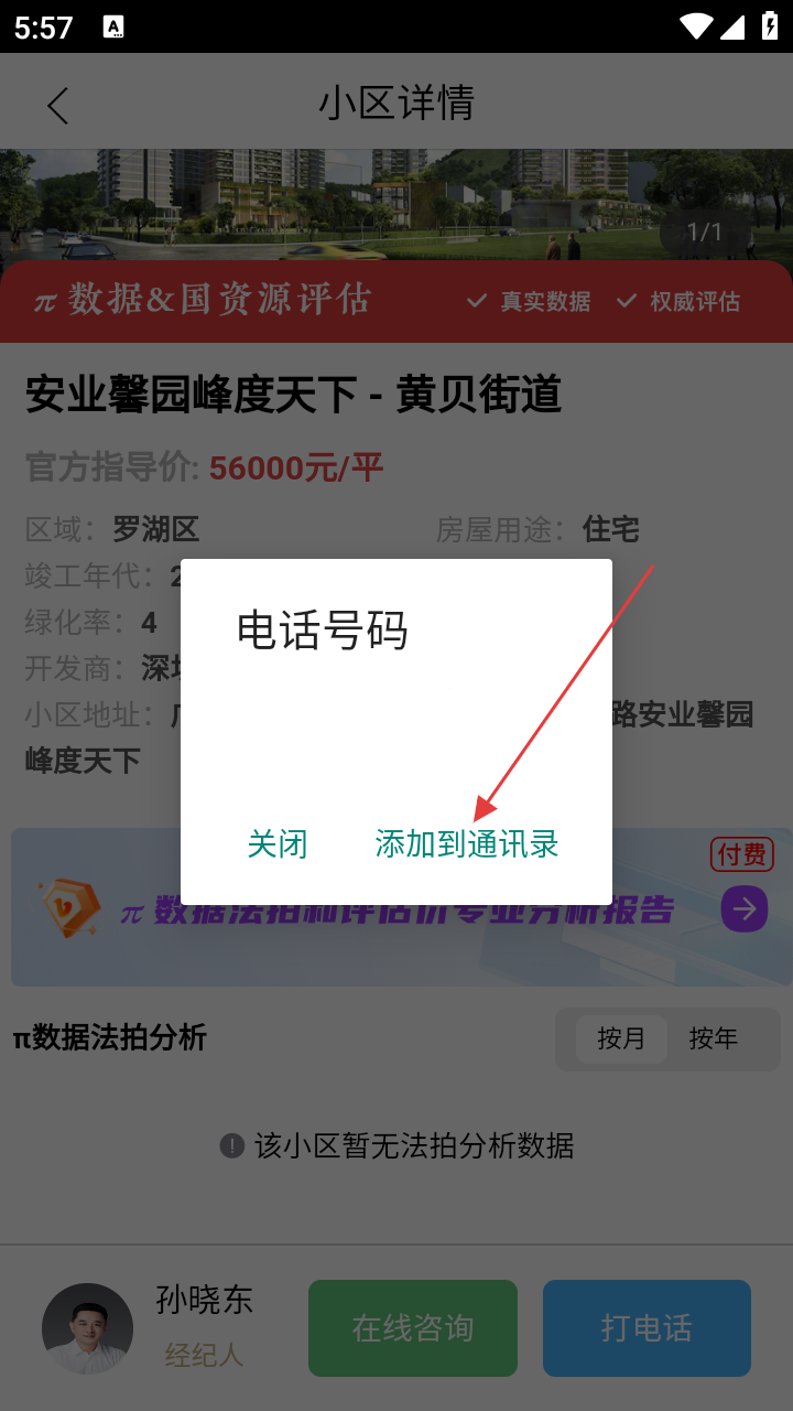 4、点击【在线咨询】后,会弹出电话号码相关弹窗,可选择【添加到通讯录】,方便后续联系。