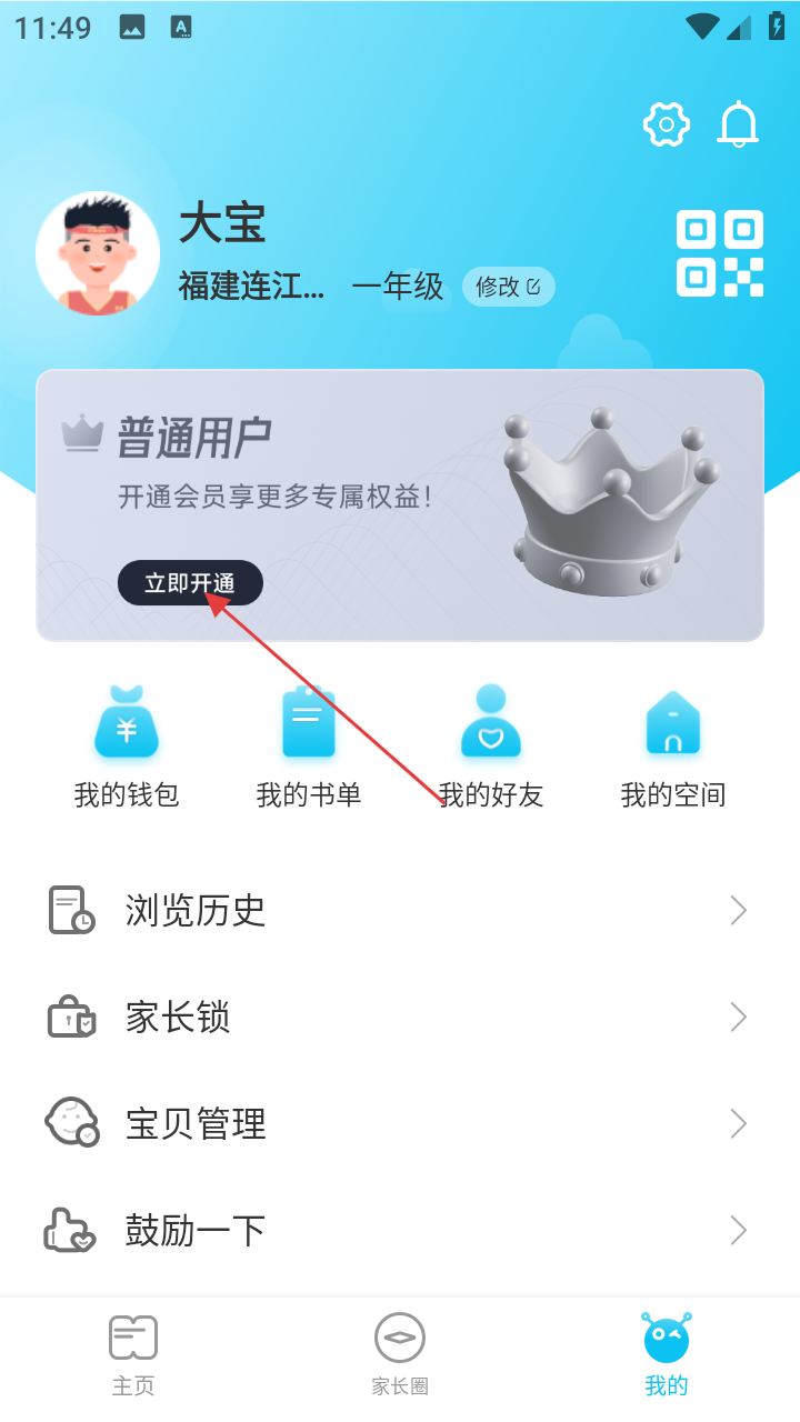 2、在【我的】页面,可看到用户信息,点击【立即开通】可进入会员开通流程,还能使用【我的钱包】【我的书单】等功能。