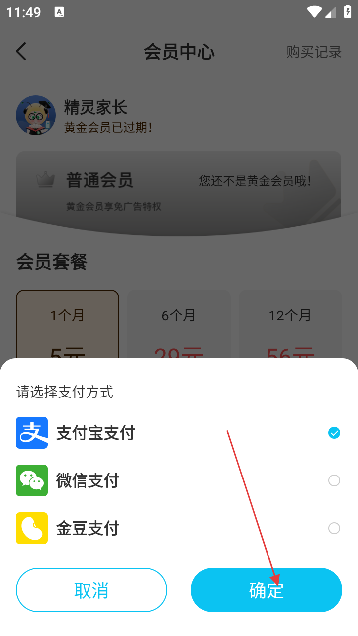 4、在会员支付环节,可选择【支付宝支付】【微信支付】【金豆支付】三种支付方式,选择后点击【确定】即可完成支付开通会员。