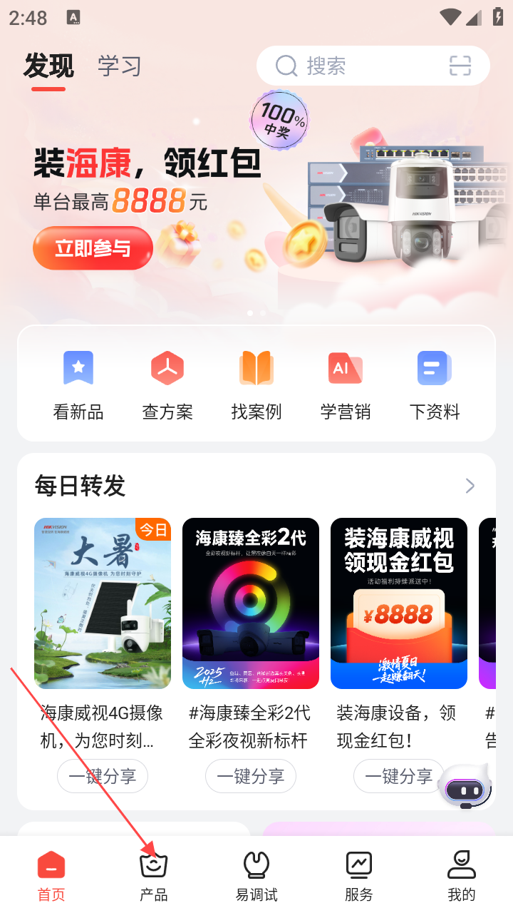 1、打开应用进入首页,在首页点击底部【产品】,进入安防产品页。