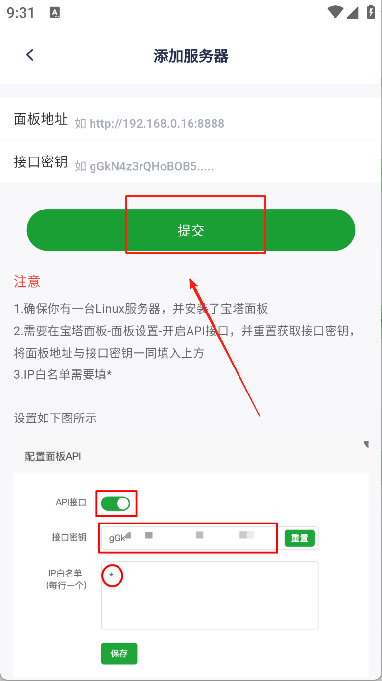 2、输入面板地址和接口密钥,点击“提交”以保存服务器信息。