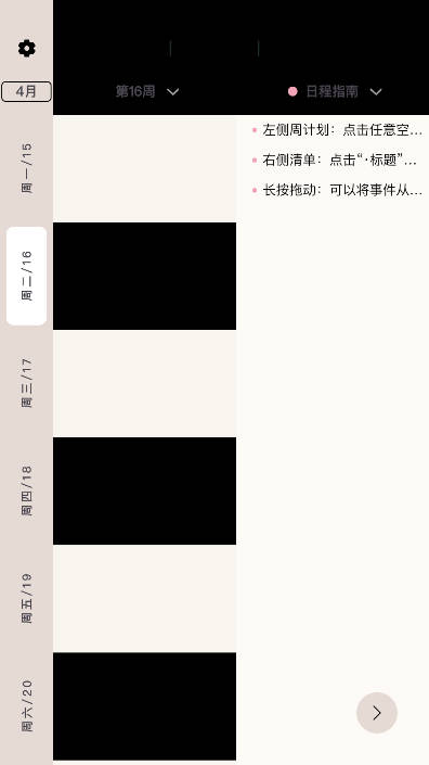 1.日程管理:提供周计划视图,左侧为笔记式自由编辑区(可填写每日计划),右侧为清单预览区(支持拖拽任务),实现“计划-执行”一体化。