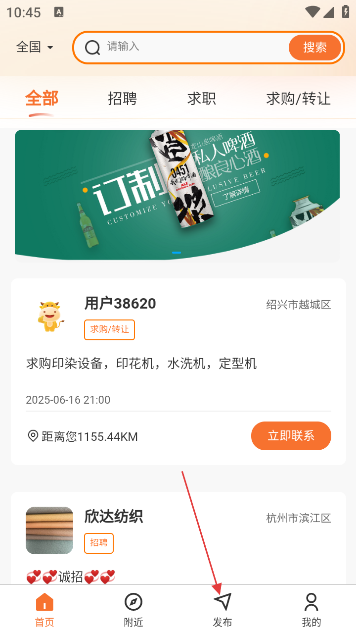 1、进入平台首页,可看到【招聘】【求职】【求购/转让】等板块,还能浏览用户发布的各类信息,如求购印染设备等。