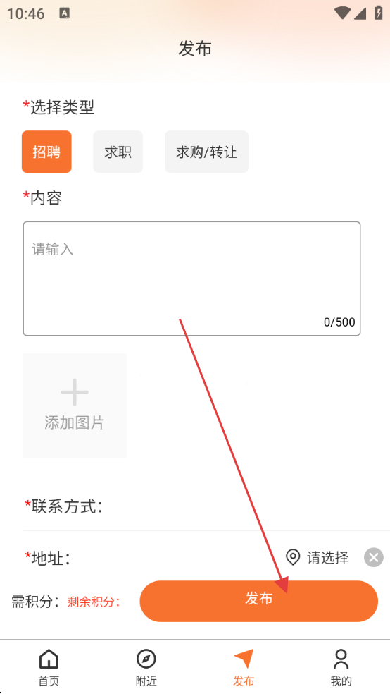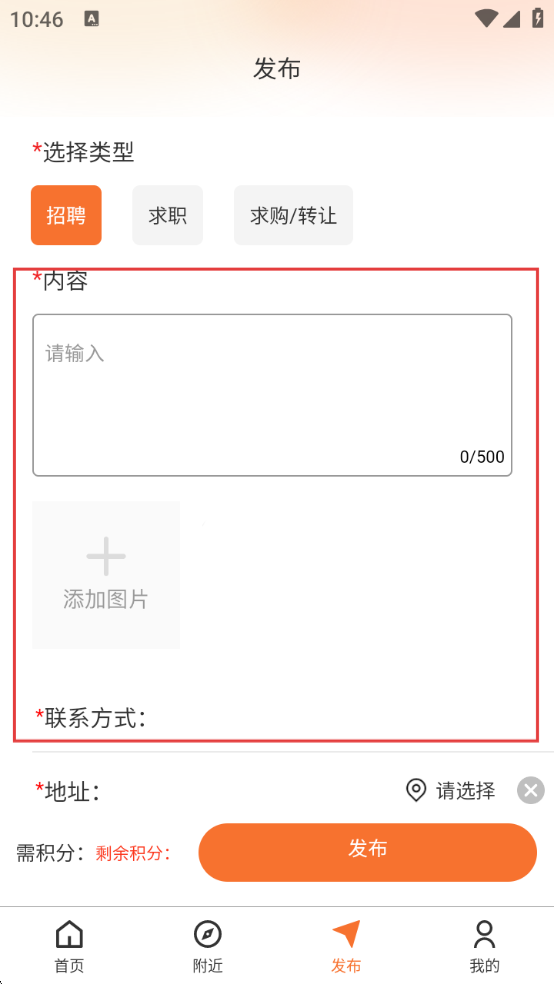 3、登录后进入发布页,先选择信息类型,如【招聘】【求职】【求购/转让】,再填写内容,可添加图片。