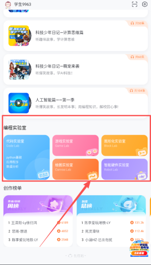 1、下载进入猿编程HDapp,进入首页,在上方有多种编程实验室;