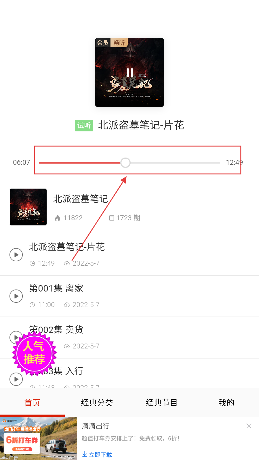 4、播放时,拖动【进度条】,即可调整收听播放进度。