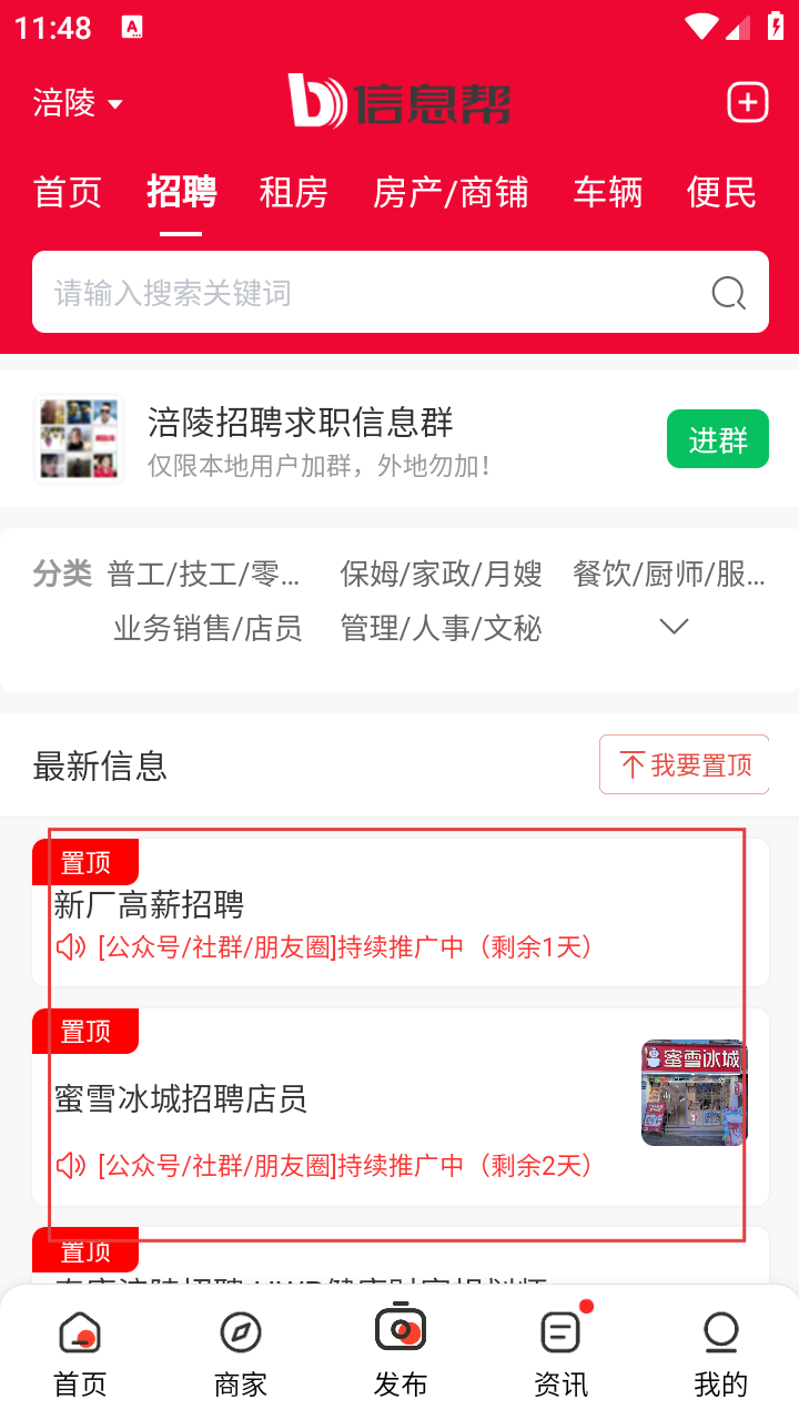 2、进入招聘页面,可查看各类招聘信息,如“新厂高薪招聘”“蜜雪冰城招聘店员”等。