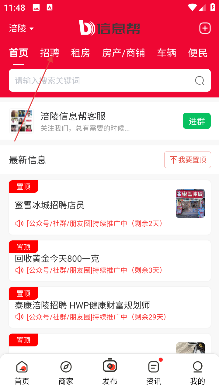 1、打开“信息帮”,进入首页,可看到招聘、租房等板块,也能浏览最新信息,点击【招聘】板块。