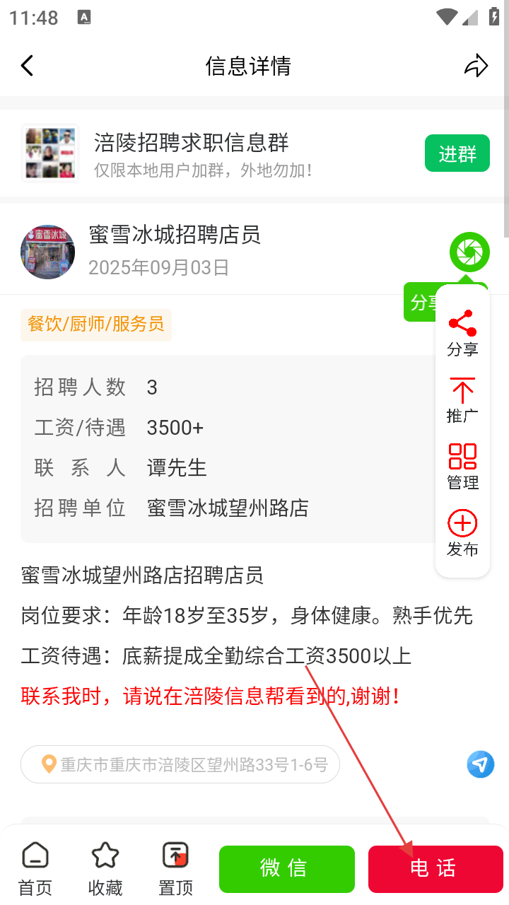 3、点击感兴趣的招聘信息,进入信息详情页,可查看招聘人数、工资待遇等详情,若想联系,可点击【电话】按钮,需登录账号。