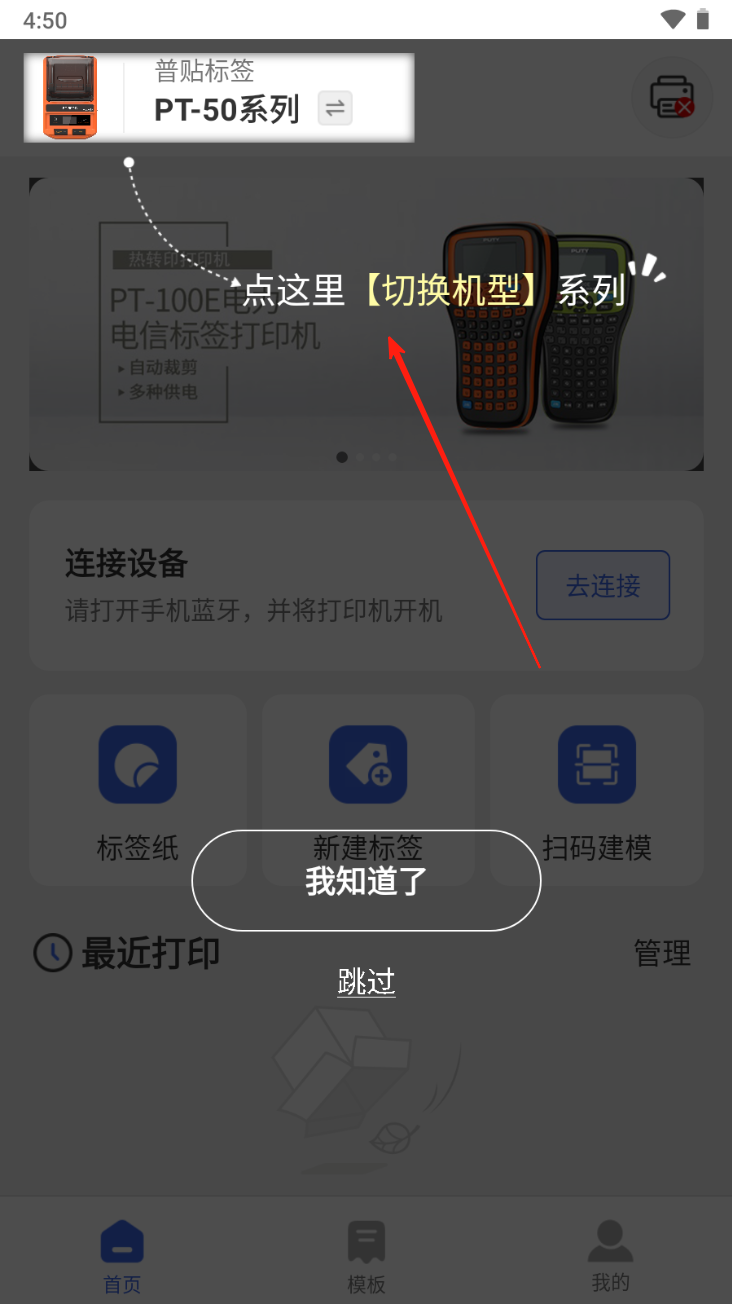 2、连接设备:点击“去连接”按钮,打开手机蓝牙并连接打印机。