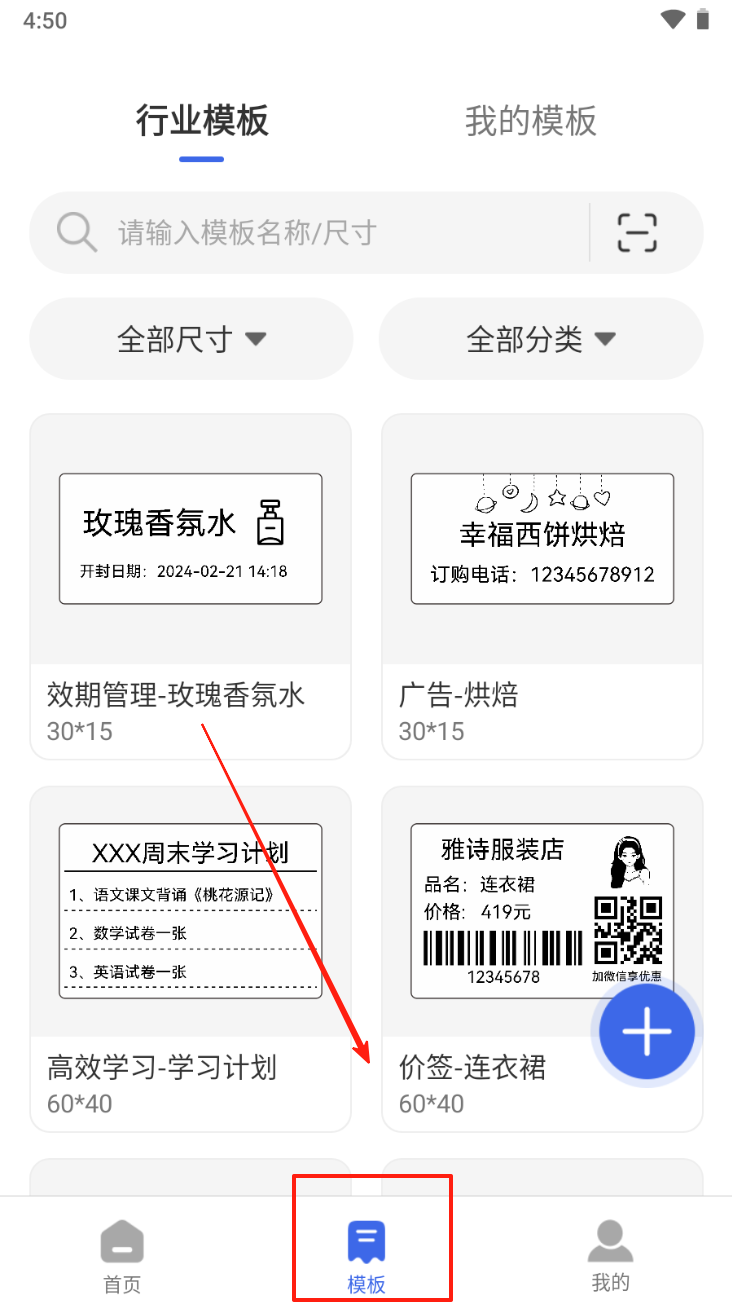 4、定期访问"模板市场"获取最新行业标签样式,企业用户可上传自制模板至私有云空间共享使用。