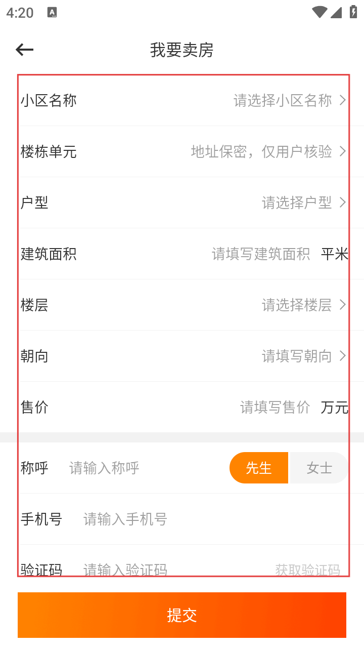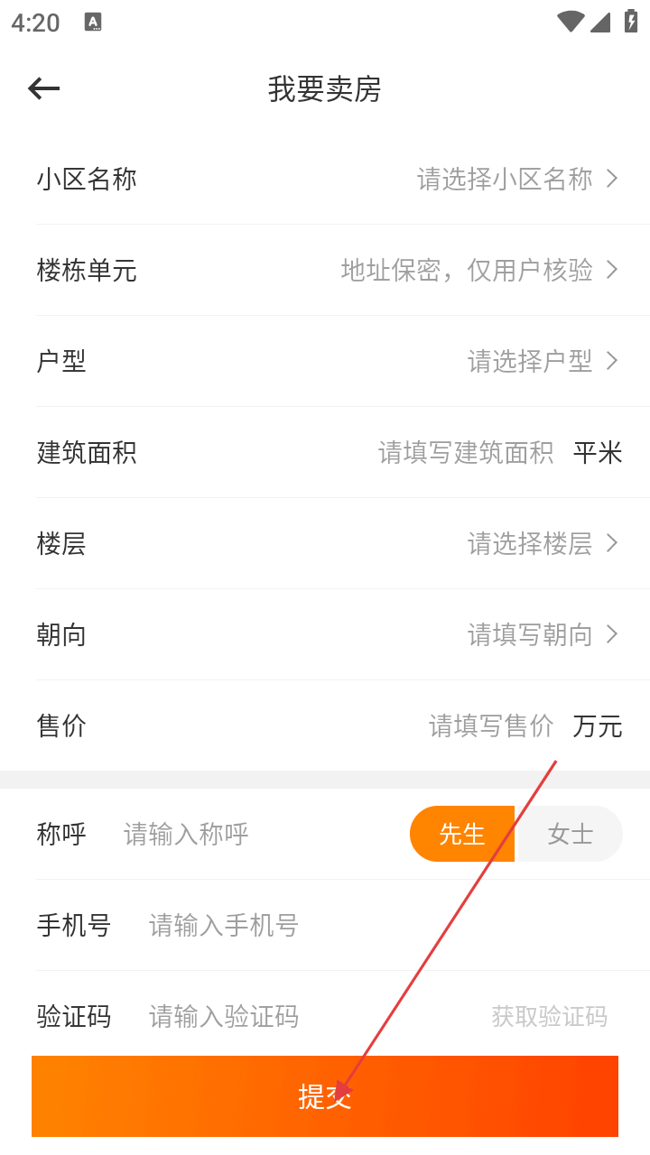 2、在【我要卖房】页,依次填写小区名称、楼栋单元、户型、建筑面积、楼层、朝向、售价、称呼、手机号、验证码等信息。