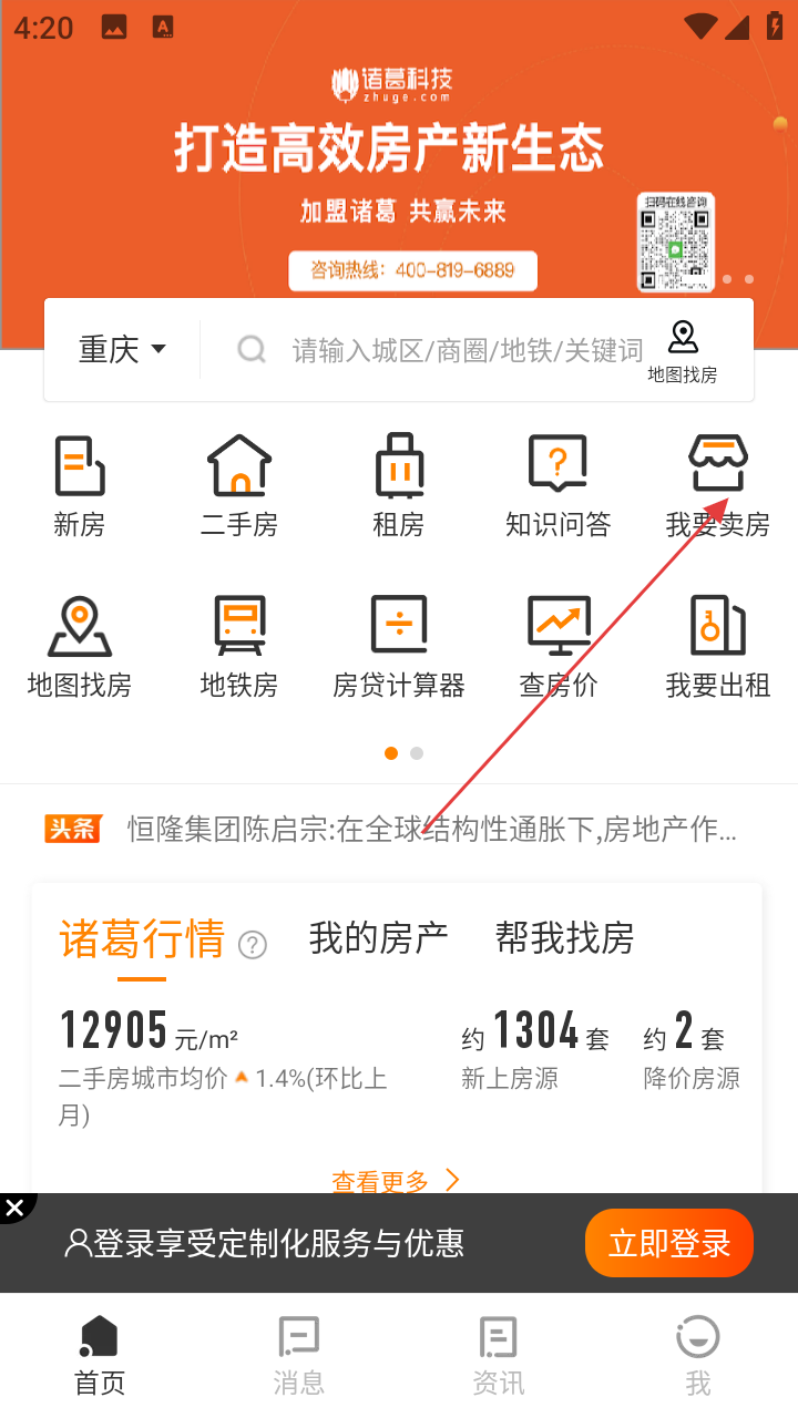 1、打开“诸葛找房”应用,在首页点击【我要卖房】,进入卖房信息填写流程。