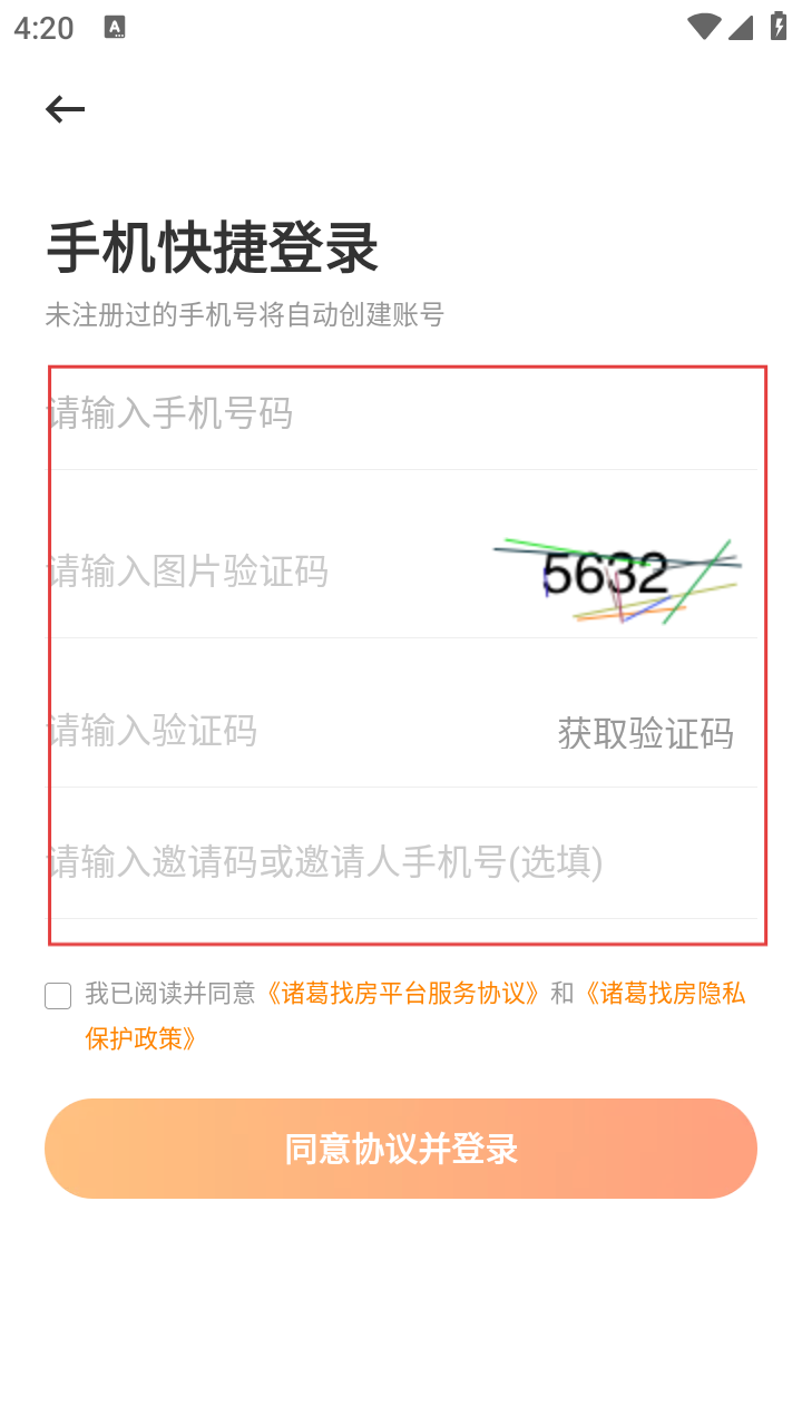 4、跳转至登录界面,在【手机快捷登录】页填手机号码、图片验证码、验证码等,勾选同意协议后,点击【同意协议并登录】完成登录。