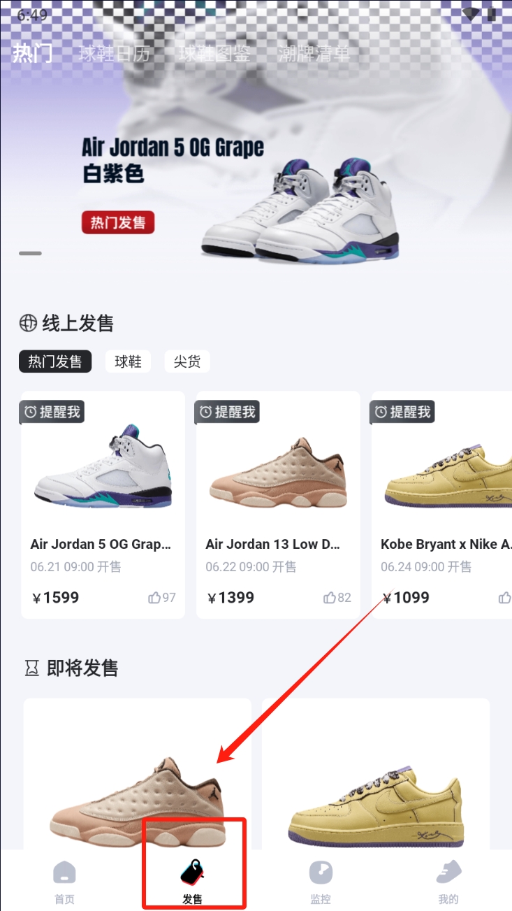2、在商品页面点击“发售”按钮,查看即将发售的运动鞋并设置提醒。