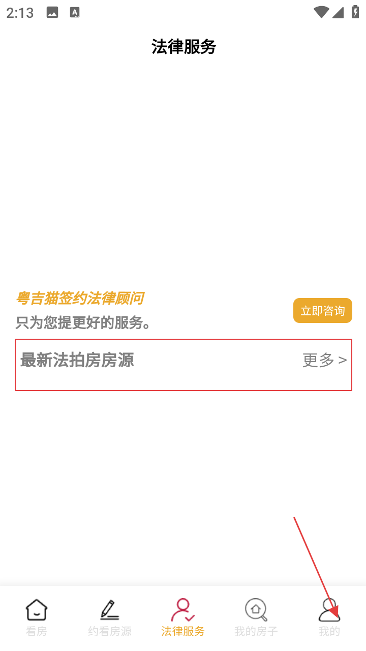 1、打开粤吉猫,进入法律服务页面,点击底部【我的】,进入个人页面。