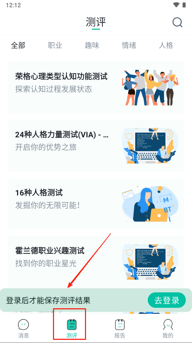 3、查看测评报告。点击“报告”图标,查看并分析您的测评结果。