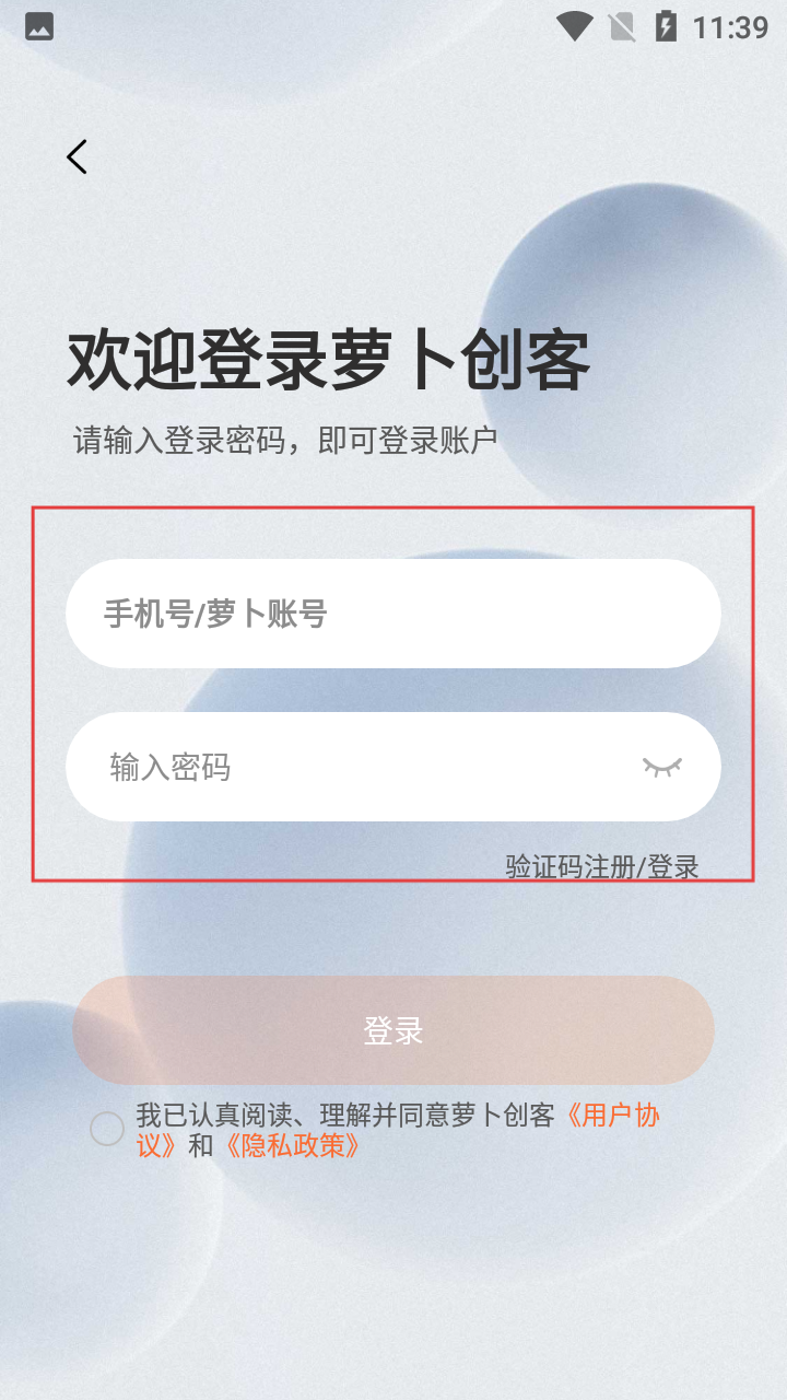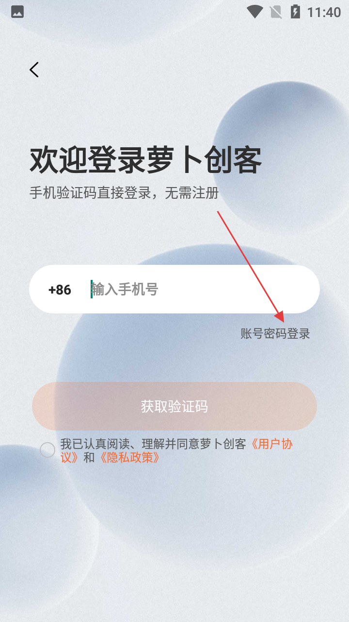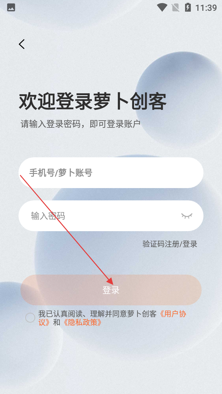 1、首次用萝卜创客,在协议页点【同意】,进入登录环节。