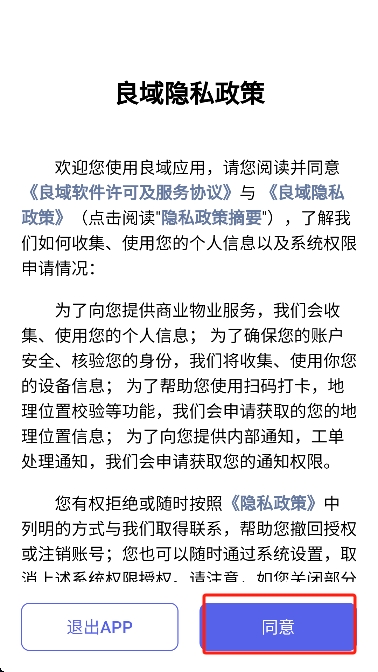 1、首先阅读并同意良域软件的隐私政策,点击“同意”按钮继续。这是使用良域软件的第一步,确保您了解并同意相关条款。