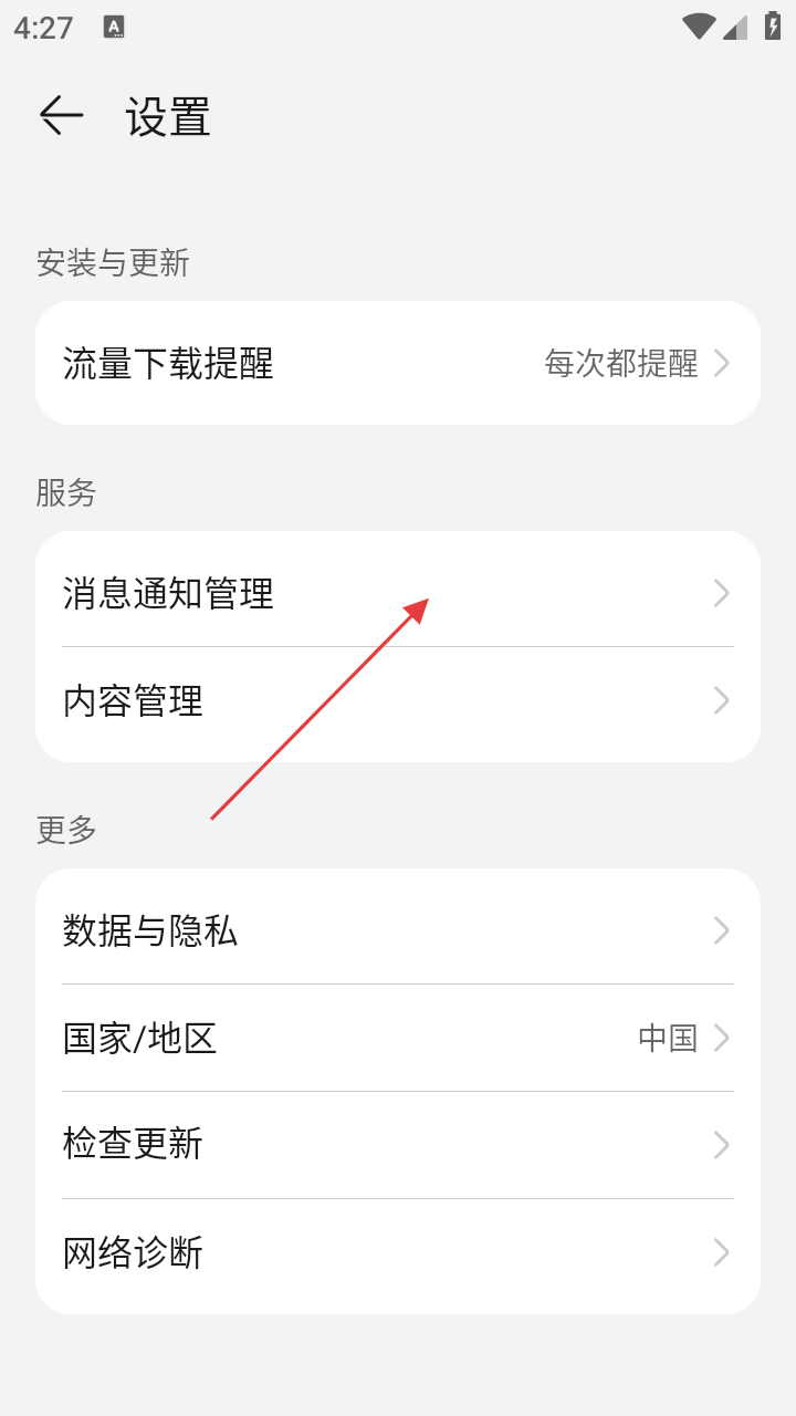 3、在设置界面,点击【消息通知管理】进入消息通知管理页面,还能对安装与更新、数据与隐私等进行设置。