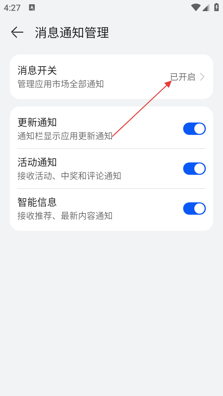 4、在消息通知管理页面,可对【消息开关】【更新通知】等进行管理,点击【消息开关】可开启或关闭应用市场全部通知。